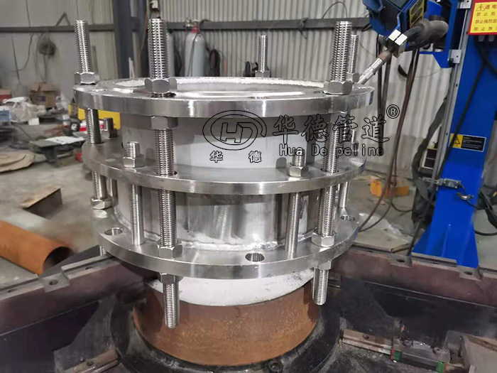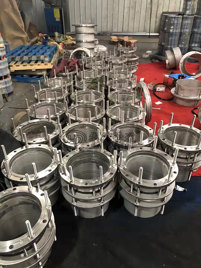4.不銹鋼傳力接頭金屬和密封圈嚴格按使用性能及用戶要求選用。材質外部涂裝高強度防腐漆料,各部連接螺栓為高強度碳鋼或不銹鋼制作。因為本體與伸縮管之間有一定間隙,使它具有一定的軸向和徑向位